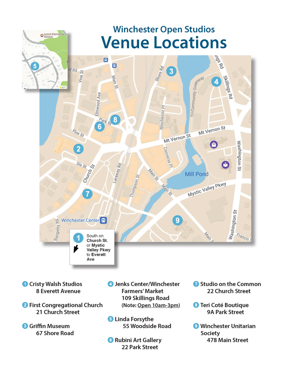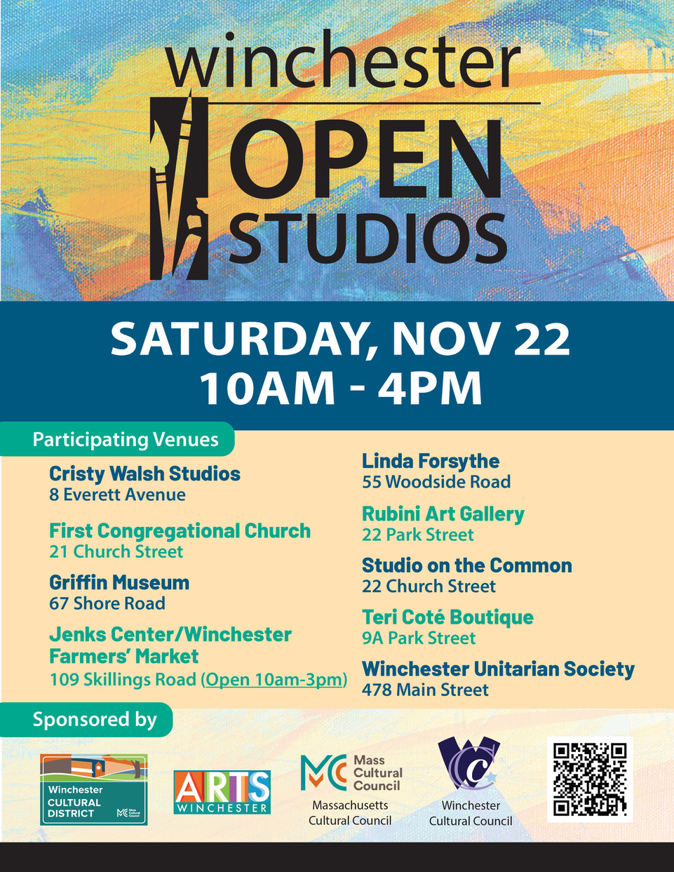 Winchester Open Studios is a community arts celebration held at several locations throughout Winchester. Artists exhibit their painting, ceramics, textiles, jewelry, woodworking, pottery, and many other varieties of artworks and make them available for sale. The winter Farmers' Market at the Jenks Center offers fresh produce and other foods as well as art from local artists. There is no admission charge at any of the venues.